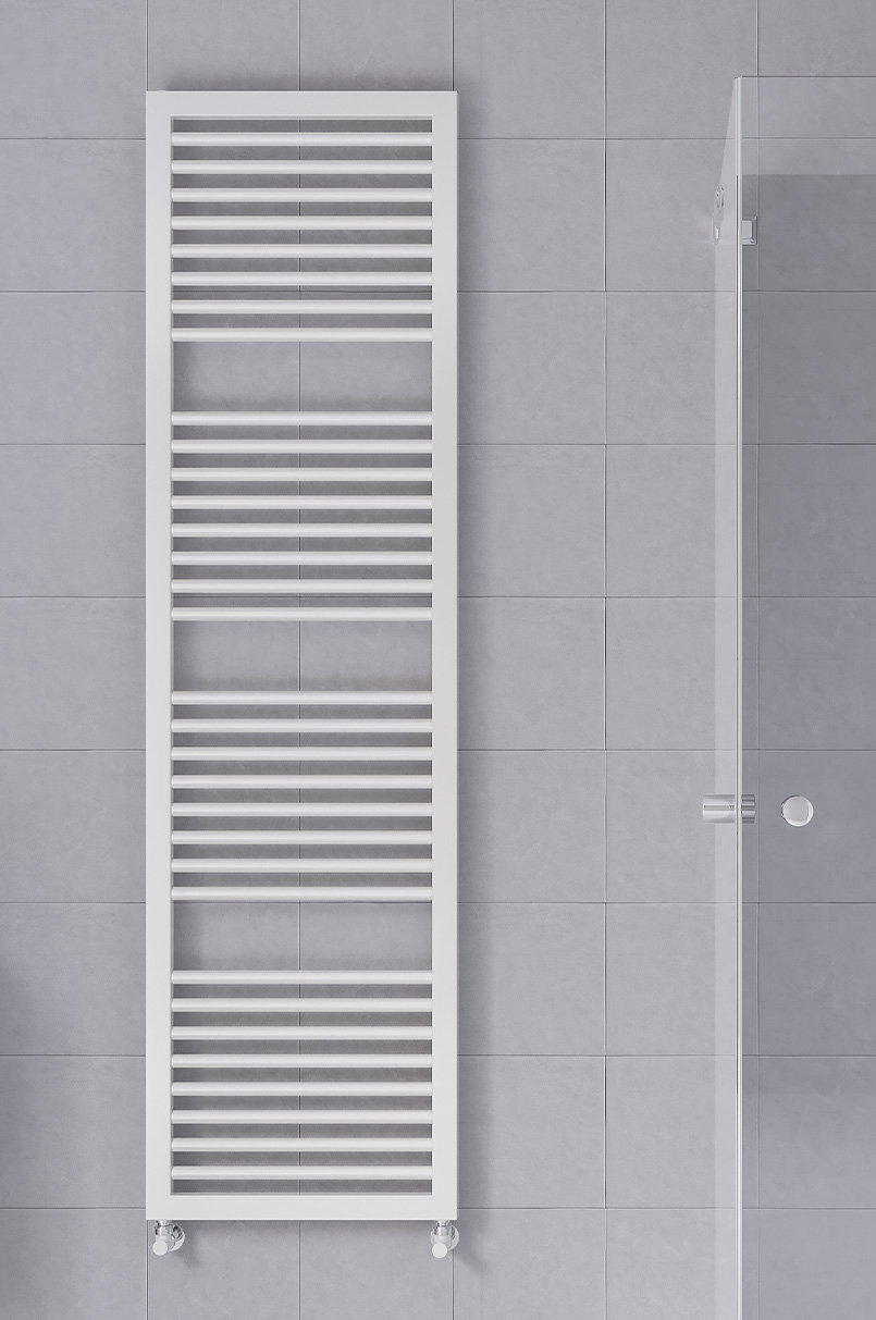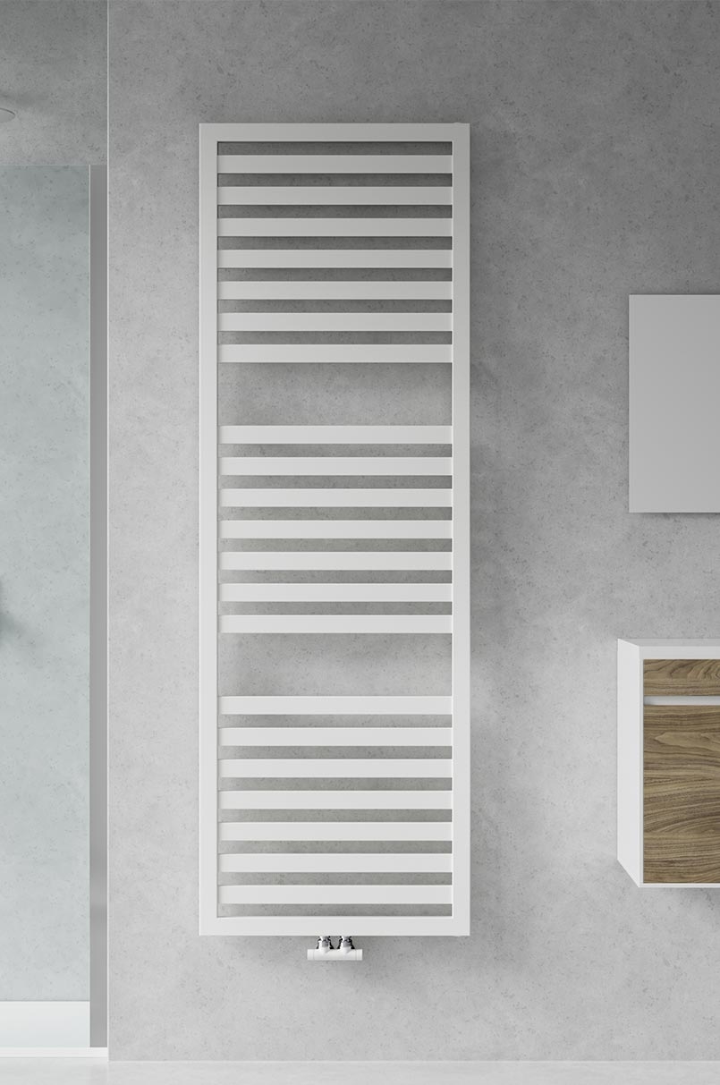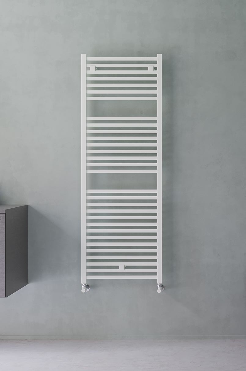 Scaldasalviette da bagno in acciaio con collettori laterali rettangolari 40x30 mm e tubo tondo orizzontale dal diametro di 22 mm saldobrasato. Mensole nascoste.