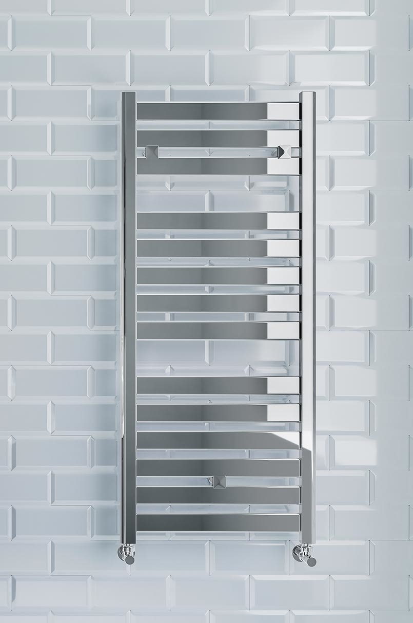 Scaldasalviette da bagno in acciaio con collettori laterali tondi dal diametro di 35 mm e tubo piatto dritto orizzontale 70x11 mm saldobrasato. Quattro mensole rettangolari.
