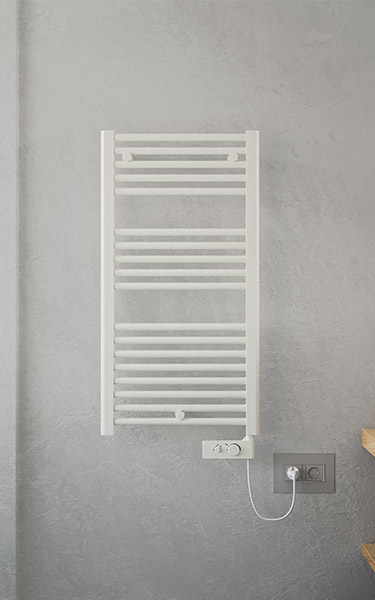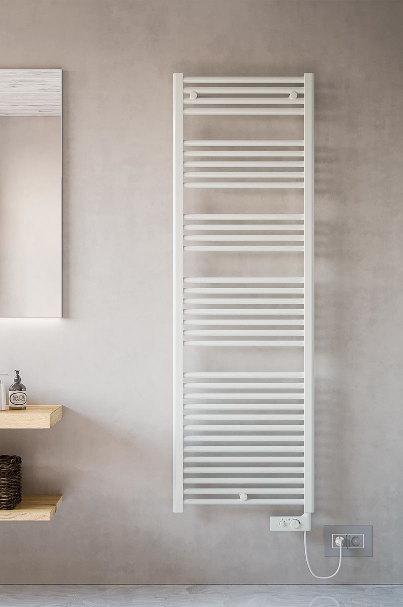 Scaldasalviette elettrico da bagno in acciaio con collettori laterali a forma di “D” 40x30 mm e tubo dritto tondo orizzontale dal diametro di 22 mm saldobrasato. Tre mensole tonde.