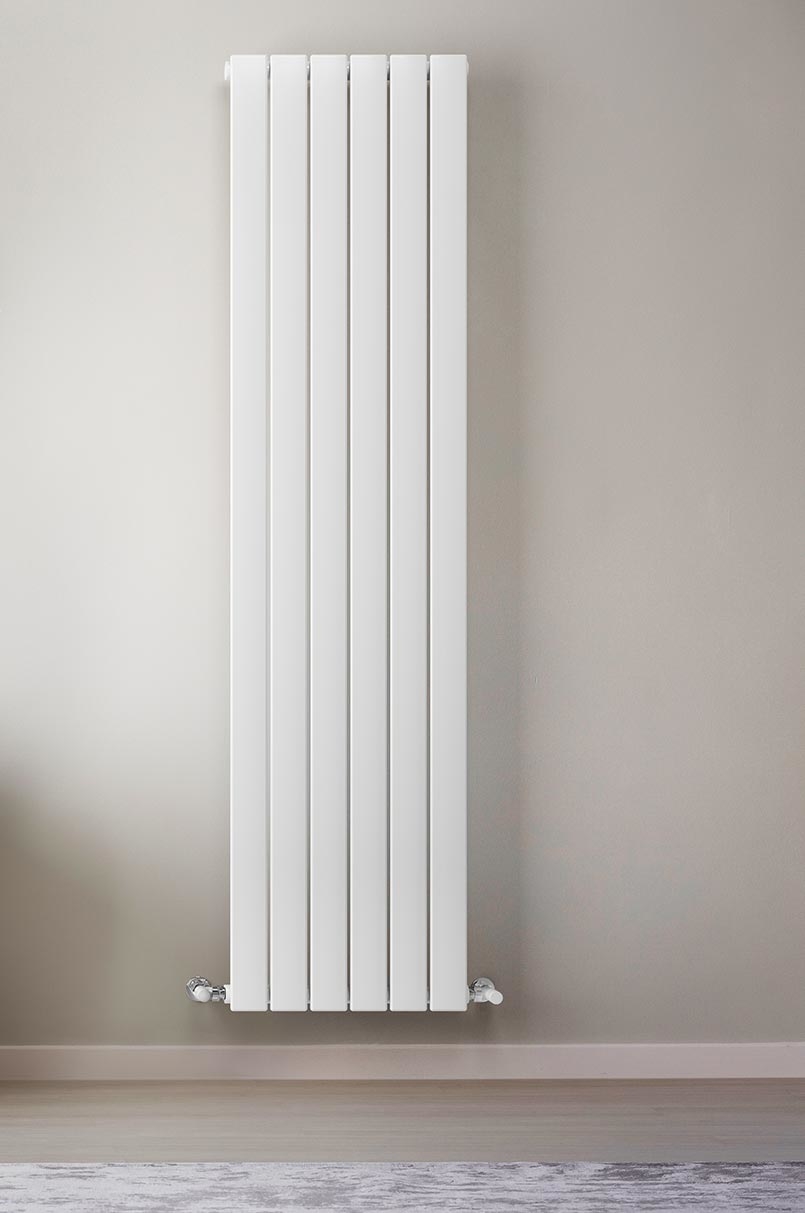 Radiatore d'arredo in acciaio con collettori tondi orizzontali dal diametro di 35 mm e tubi piatti verticali 70x11 mm in fila singola o doppia. Mensole nascoste.